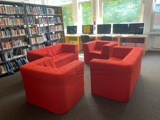 Der Lesesaal direkt hinter unserem Abi-Trainingslager, einer Abteilung mit dem geballten Wissen für die finalen Prüfungen, gehört der Oberstufe. Ungestört von den „Kleinen“ können sich die angehenden Abiturienten in einer Sitzecke zurückziehen oder an den für sie reservierten PC-Arbeitsplätzen lernen.