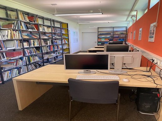 Längst ist unsere Bücherei auch ein zentraler Ort, an dem die Schüler Medienkompetenz erwerben. Insgesamt 12 Computer stehen in der Bücherei. Hier können PowerPointPräsentationen vorbereitet und Internet-Recherchen geübt werden. Während der großen Pausen werden Lehraufträge in den Computer-Räumen erledigt.