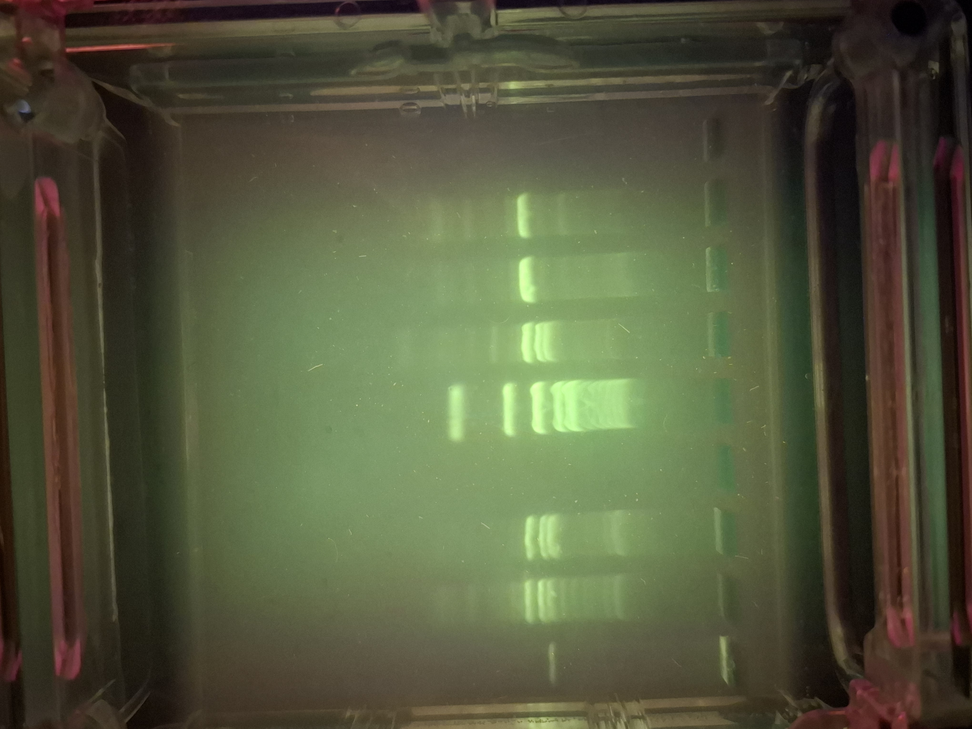 So kann bestimmt werden, welche Personen im Kurs - genetisch betrachtet - Langschläfer oder Frühaufsteher sind. Die Ergebnisse der Gelelektrophorese werden fotografisch festgehalten, die DNA - Moleküle und der Vergleichsmaßstab (Marker) sind im UV-Licht sichtbar. Die doppelt leuchtenden Streifen stammen von Testpersonen mit beiden Varianten (also Früh- und Spätaufsteher-Gen, jeweils von einem Elternteil vererbt bekommen). Ganz rechts erkennt man nur einen Streifen, einer Testperson mit Frühaufsteher-Gen. Die vielen Banden in der Mitte zeigen den Marker.